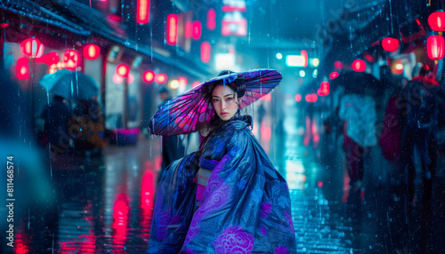 Young woman posing for a waterproof clothing commercial, in the rain, in a city in China.