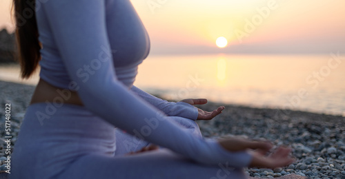 Young woman practice yoga and meditation near the sea at sunrise, healthy lifestyle concept, lotus position