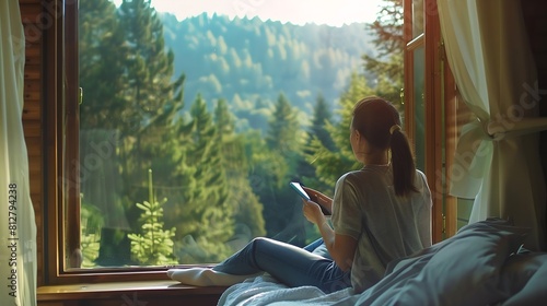 Young woman resting at beautiful country house or hotel sitting with tablet on the window sill enjoying beautiful view on pine forest View from outside Beautiful destinations for vacat : Generative AI