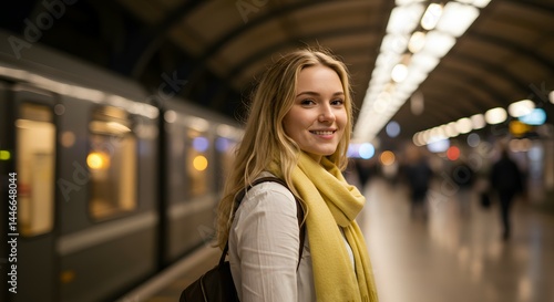 Young Woman Smiling at Train Station, Nighttime Commute, Urban Travel Photography