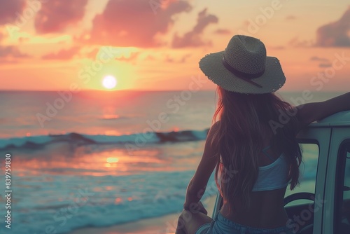 Young woman traveler sitting on a car and looking a beautiful sunset at the beach while travel driving road trip on vacatio