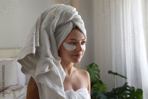 Young woman wearing a towel after showering, pampering the under eye patch for dark circles treatment. Female applying cosmetic products to decrease puffiness under her eyes. Close up, background.