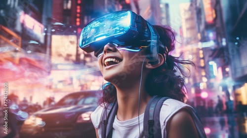 Young woman wearing a VR headset is amazed by the surreal world and virtual reality on the streets of a neon cyberpunk city.