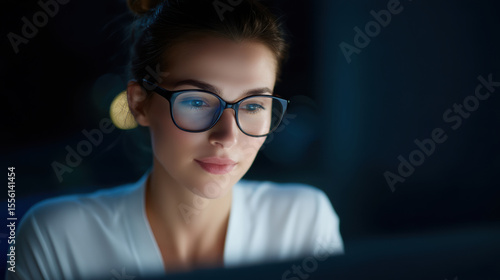 Young woman wearing glasses with blue light filter while working computer night, focused and calm, modern indoor setting, with soft lighting creating cozy atmosphere, emphasizing concentration