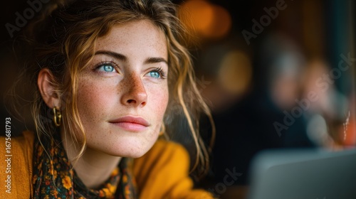 Young woman with blue eyes and freckles gazes thoughtfully while seated in a cozy caf?
