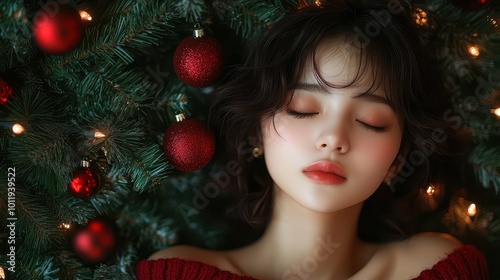 Young woman with closed eyes wearing a red sweater surrounded by red Christmas ornaments