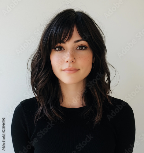 Young Woman with Wavy Hair and Black Sweater, Headshot portrait, Wolf Hair Cut, Black Hair,