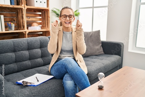 Young woman working at consultation office excited for success with arms raised and eyes closed celebrating victory smiling. winner concept.