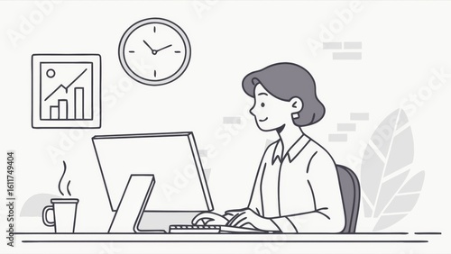Young Woman Working at Desk with Computer and Coffee in Minimalist Style