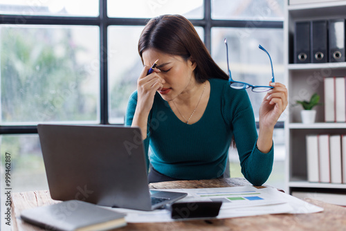 Young woman working on laptop having headache. Bored workaholic female accountant employee with headache and stress. Businesswoman woman with migraine, stress relief, chronic pain