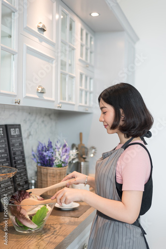 young women are cooking in the kitchen, family activities, Healthy food at home. Happy woman is preparing the vegetables and fruit in the kitchen.
