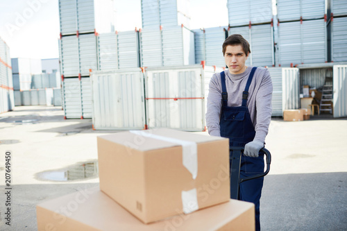 Young worker pushing heap od packed boxes in front of himself during outdoor work
