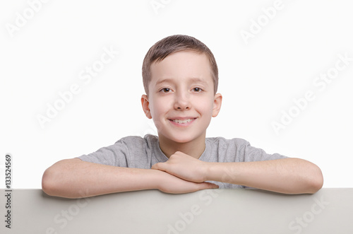 Your text here. Smiling boy standing near empty blank board.