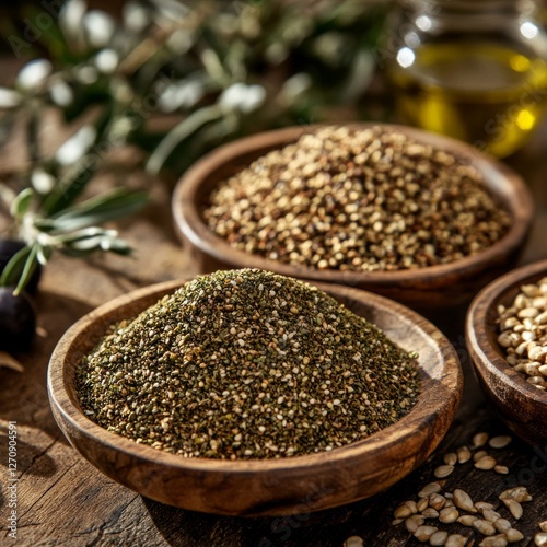 Zaatar spice blend with sesame seeds and olive oil on rustic table