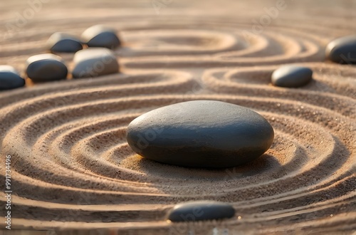 Zen garden with dark rounded stones