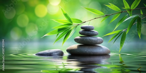 Zen stones balanced on a calm pond, a serene oasis in the midst of lush foliage