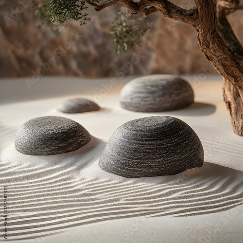 Zen Stones in a Sand Garden: A serene scene of smooth, gray zen stones arranged in a minimalist sand garden, capturing the essence of peace and contemplation.