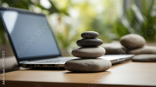 Zen stones on the desk with an off-focus laptop in the office background 3d illustration image.