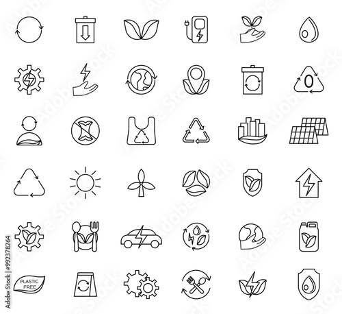Zero waste line icons set. Green energy and electricity, sustainable lifestyle. Caring for ecology and environment. Recycling and reuse. Linear vector collection