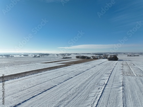 Zima na wsi, biała zima, mroźny słoneczny dzień zimowy, krajobraz wiejski zimą, biały śnieg, śnieg na polach,