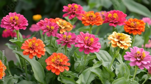 Zinnia background - A vibrant display of zinnia flowers in shades of pink, orange, and yellow, surrounded by lush green leaves.