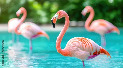 Zoo Group of flamingos standing in a shallow pond at a zoo.