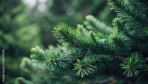 Zoomed-in view of a fir tree branch with blurred fluffy background
