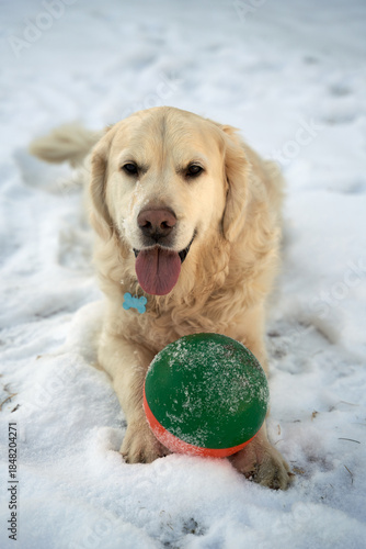 "Golden Retriever Pup Relaxing on Snowy Landscape in Oslo, Norway with Orange and Green Ball"