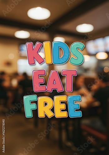 "Kids Eat Free" text overlay with a colorful, playful font on a blurred background of a busy restaurant or cafe.