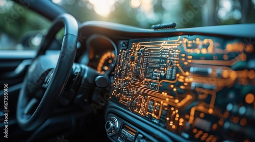 "Futuristic Car Dashboard with Digital Circuit Board Interface"
