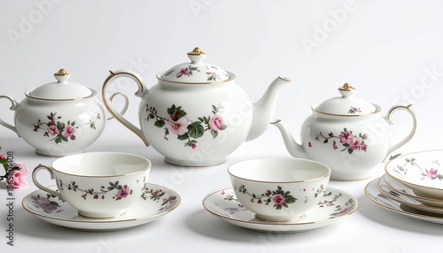 "Elegant porcelain tea set with pink rose floral pattern and gold accents arranged on white surface."