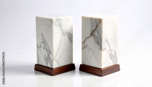 "Polished marble pedestals with gold accents and natural veining in symmetrical decorative display."