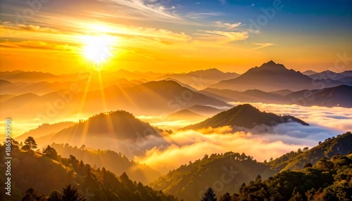 "Golden sunrise over misty mountain landscape with layered peaks and radiant sky colors."