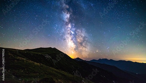 "Milky Way galaxy over silhouetted mountains under star-filled night sky in remote twilight landscape."