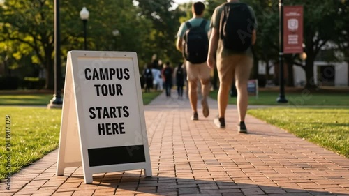 "Campus Tour Starts Here" sign on brick pathway with people walking