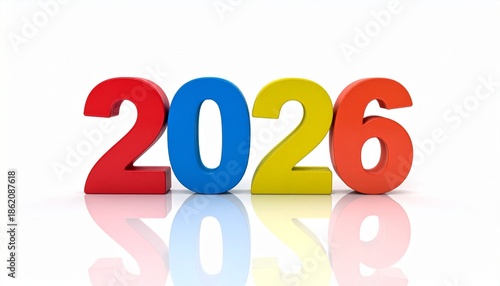 "Bold, colorful 3D digits forming '2026' with mirrored reflections on a white surface, isolated and vibrant"2026, year, digits, typography, colorful, bold, mirrored, reflection, white, surface,