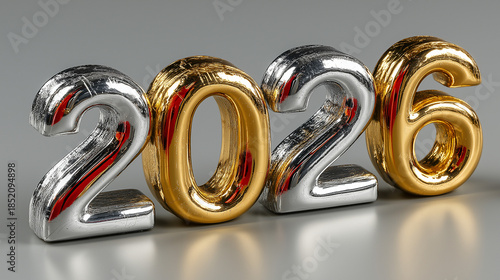 "2026" typography, sleek modern design, metallic gold and silver gradient, 3D letters floating, glossy reflective surface, luxury minimalist style, clean sharp edges