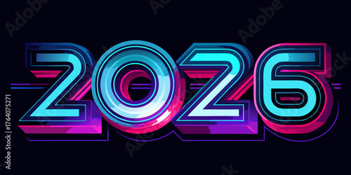 "Futuristic neon glowing 2026 text vector on dark background, modern typography design, electric blue light effect, digital countdown theme, editable EPS isolated on white background."