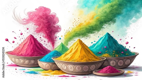 "Colorful Holi Powder in Bowls with Powder Splash"