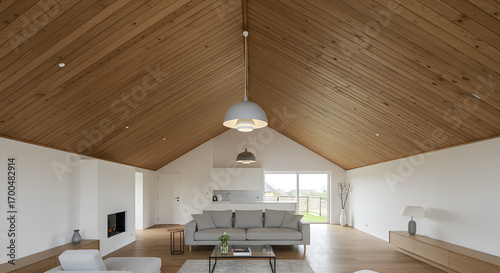 "Stylish living room with a pitched ceiling covered in natural oak acoustic slats, suspended black metal pendant lighting, floor-to-ceiling windows, and Scandinavian-inspired decor."