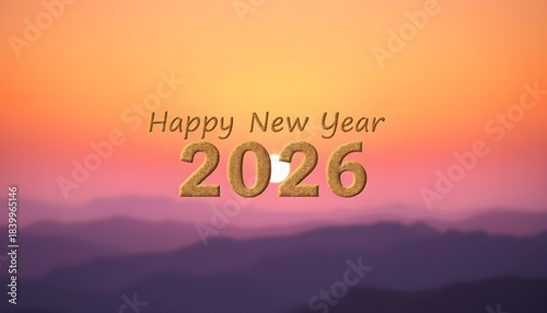 "Sunrise or sunset over mountain range with gradient sky in orange and purple hues, elegant 'Happy New Year 2026' text overlaid, serene and festive atmosphere blending natural beauty with seasonal gre