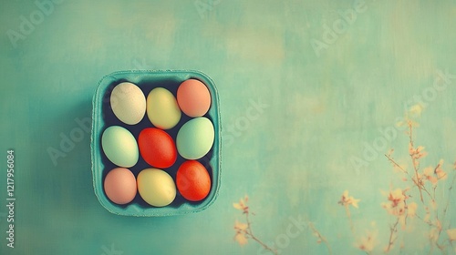 A carton of eggs sits on a table next to a tree adorned with flowers