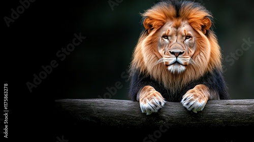 A close-up shot of a majestic lion perched atop a tree branch with its paws resting on a log