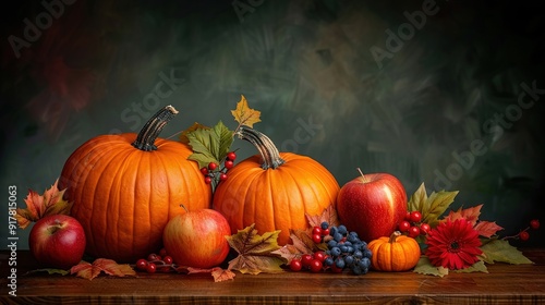 A cluster of pumpkins resting atop a wooden table, surrounded by apple decorations and other seasonal embellishments