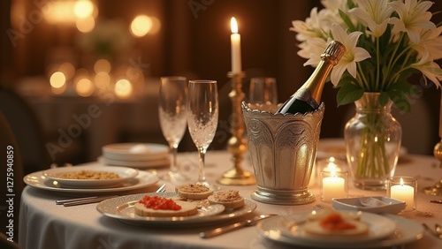 A lavish dinner setting with champagne, caviar, and white lilies., ultra detailed, 8k resolution, HDR, professional