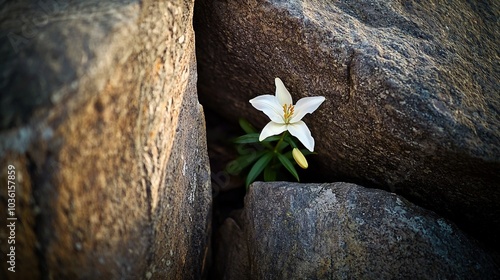 A lone white blossom emerges from a crevice in the stone wall, its green stem protruding from the heart of the rock