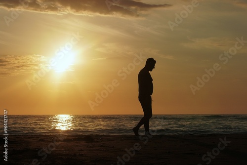A man walks along the sea at sunset. With his head down and his body relaxed, the man combines a walk in the fresh air with reflections on life and affairs.
