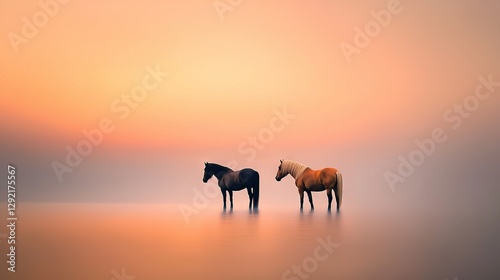 A pair of horses stand beside each other on a hazy surface before an orange-pink sky