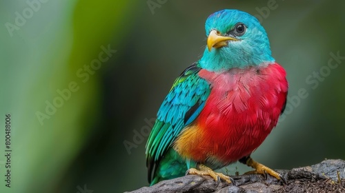 A vibrant bird perches on a tree branch, juxtaposed with a dual-toned branch—green and red Background softly blurs