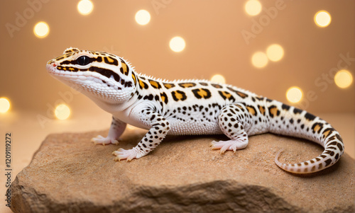 A vibrant leopard gecko soaks up warmth from a festive heat rock adorned with tiny Christmas lights, surrounded by a soft beige backdrop. The gecko's intricate scales and the textured rock